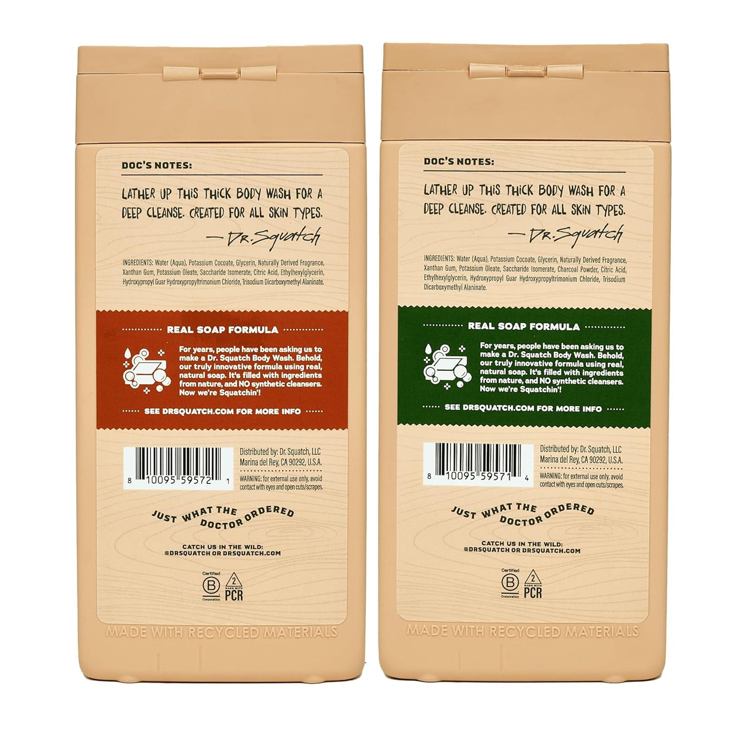 Dr. Squatch NEW Body Wash for Men with Nourishing, Natural Ingredients | No Paraben, Phthalate, Sulfate | All Day Moisture | Long Lasting Scent | Fresh Falls & Coconut Castaway (14 oz, 2-Pack)(Bourbon Bark)